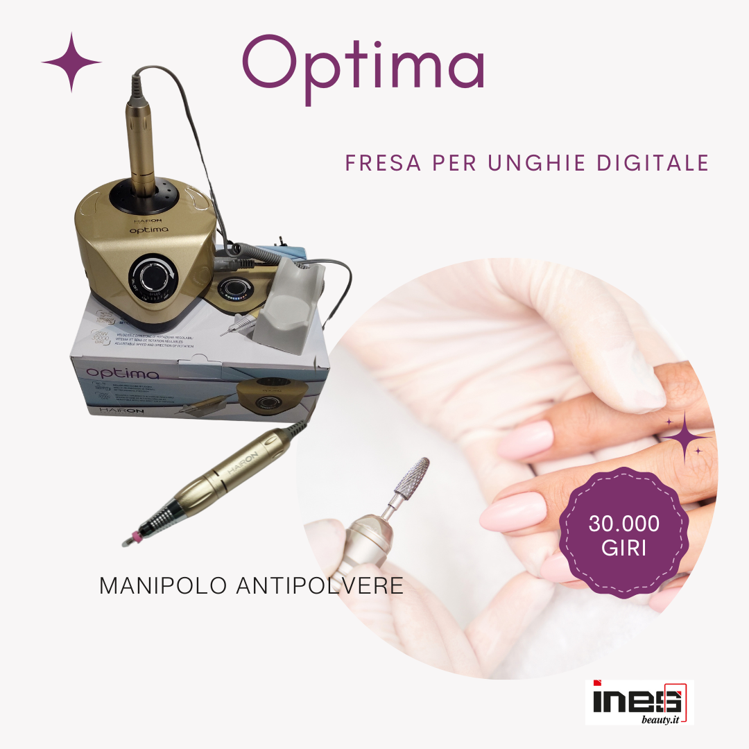 Micromotore fresa professionale nails Optima Hairon digitale da 30.000 giri al minuto. E’ possibile regolare sia la velocità che la direzione di rotazione. Optima è dotata di manipolo antivibrazione bilanciato e di anello di gomma per proteggere il manipolo dalla polvere.